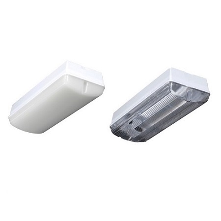 Titan Pro LED portiek/galerijverlichting serie met lichtgrijs slagvast poly-carbonaat onderhuis en opale of heldere-fresnel slagvaste poly-carbonate lichtkap.
